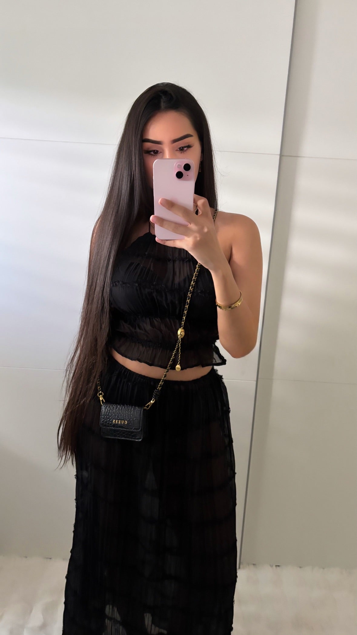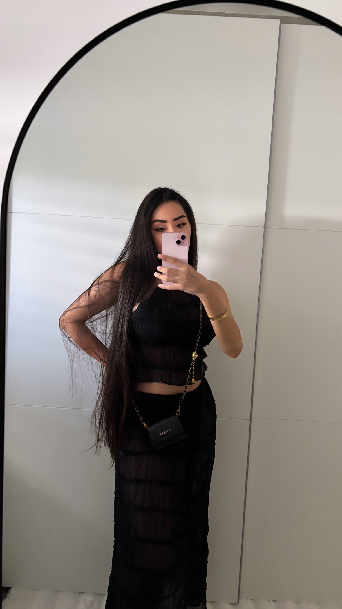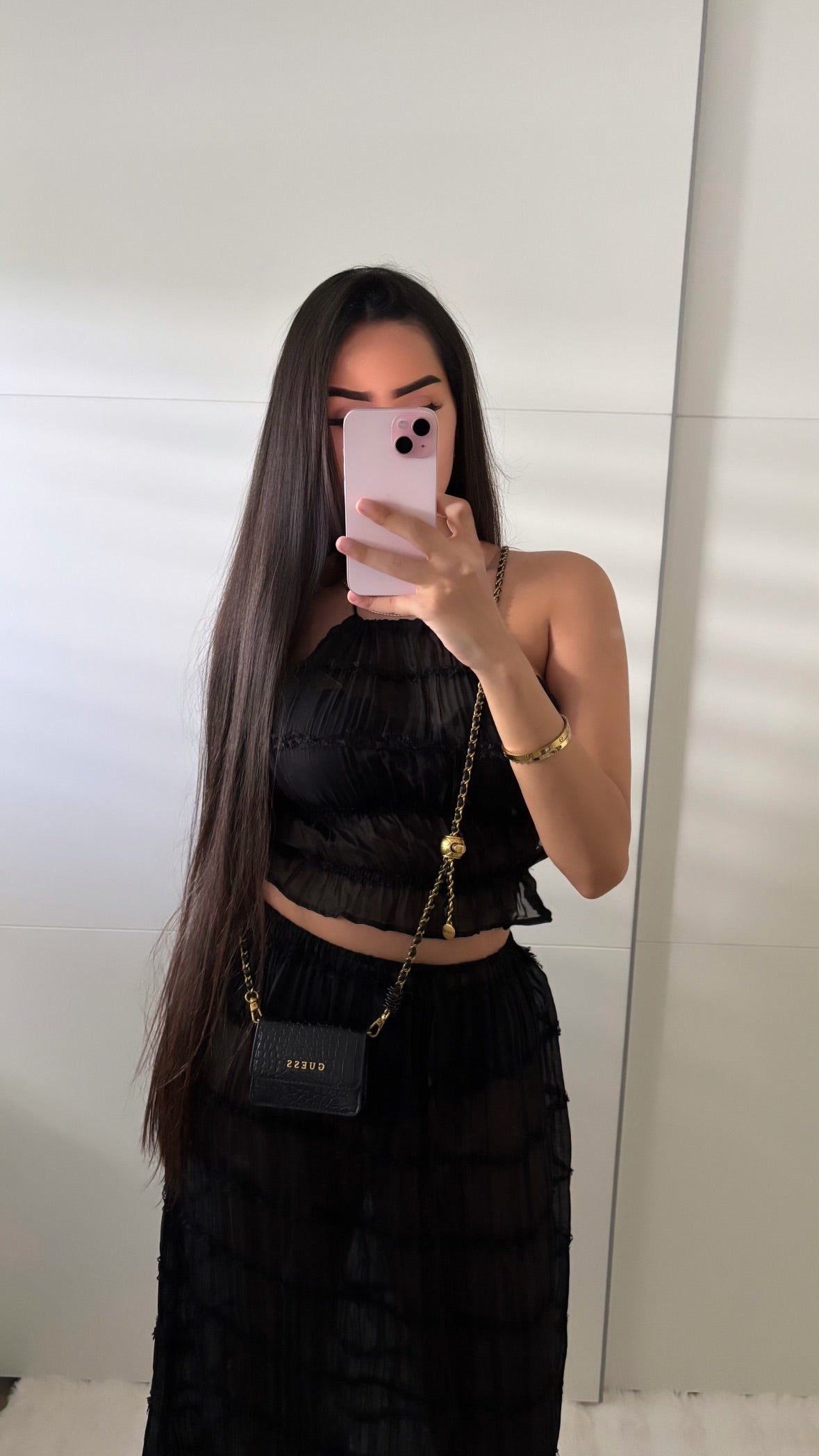 Black beach summer set that includes a sleeveless top and a matching skirt. Made of lightweight and subtly transparent fabric, suitable for both day and night occasions.