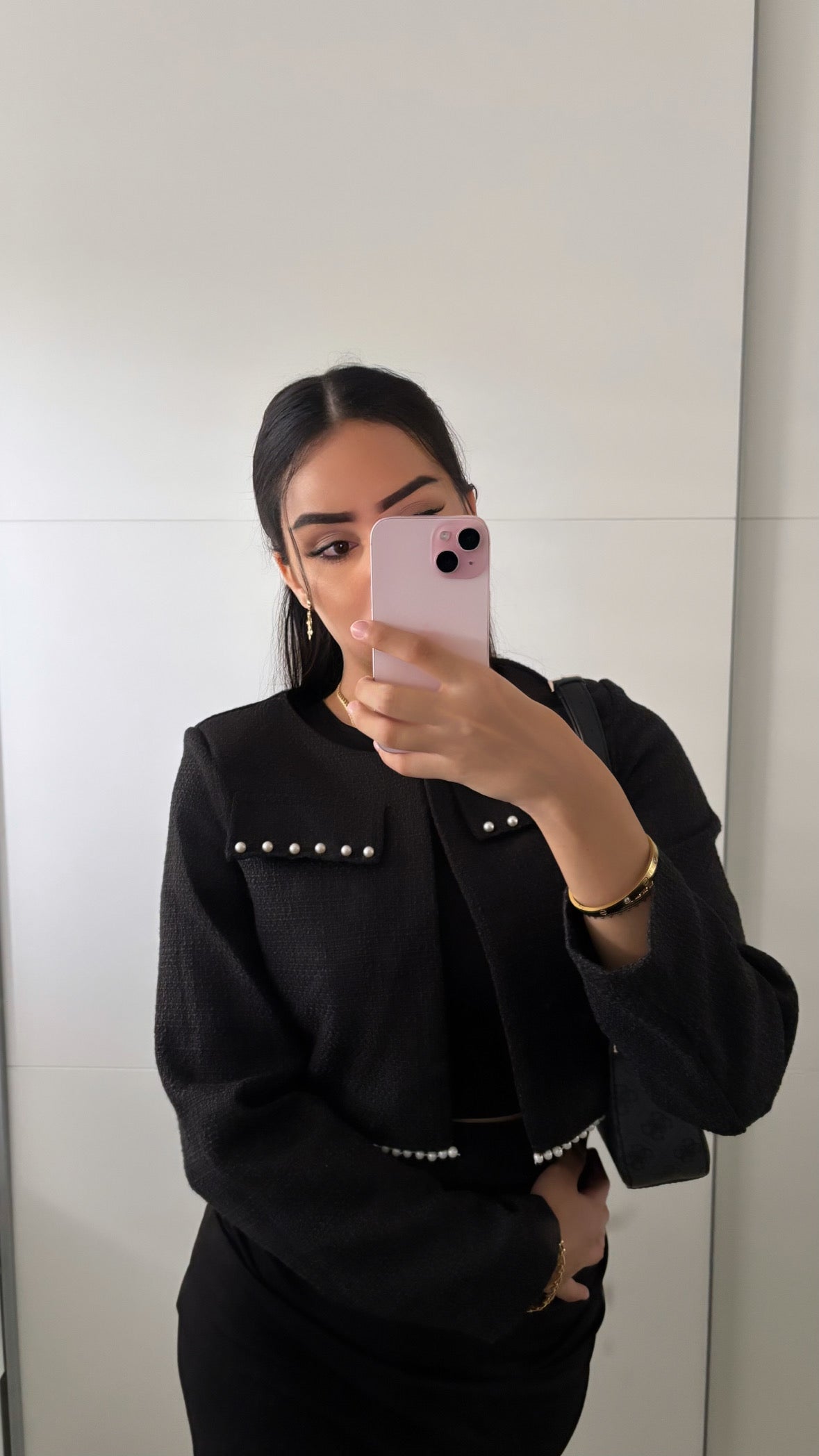 Elegant cropped black tweed jacket featuring long sleeves and delicate pearl embellishments for a refined, timeless look.