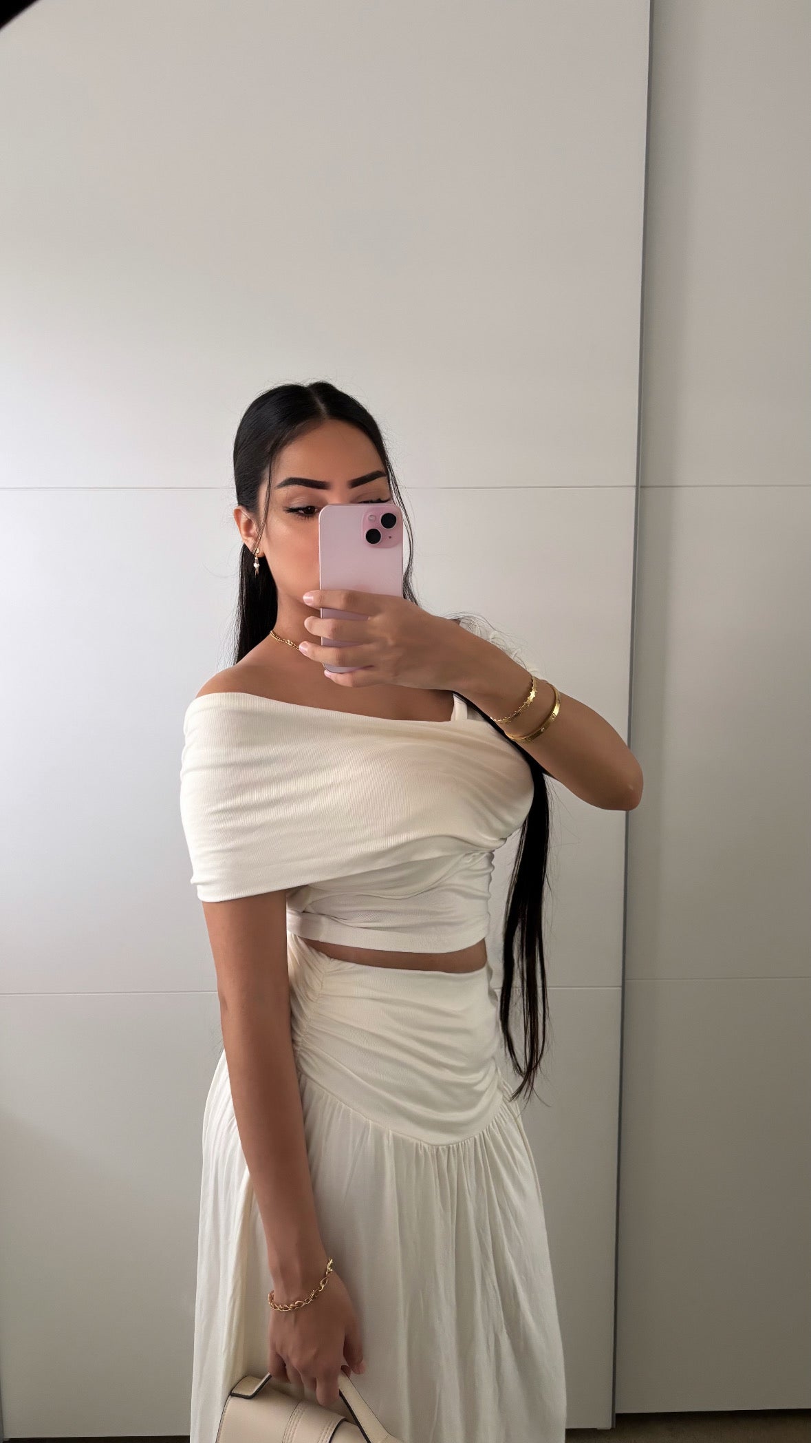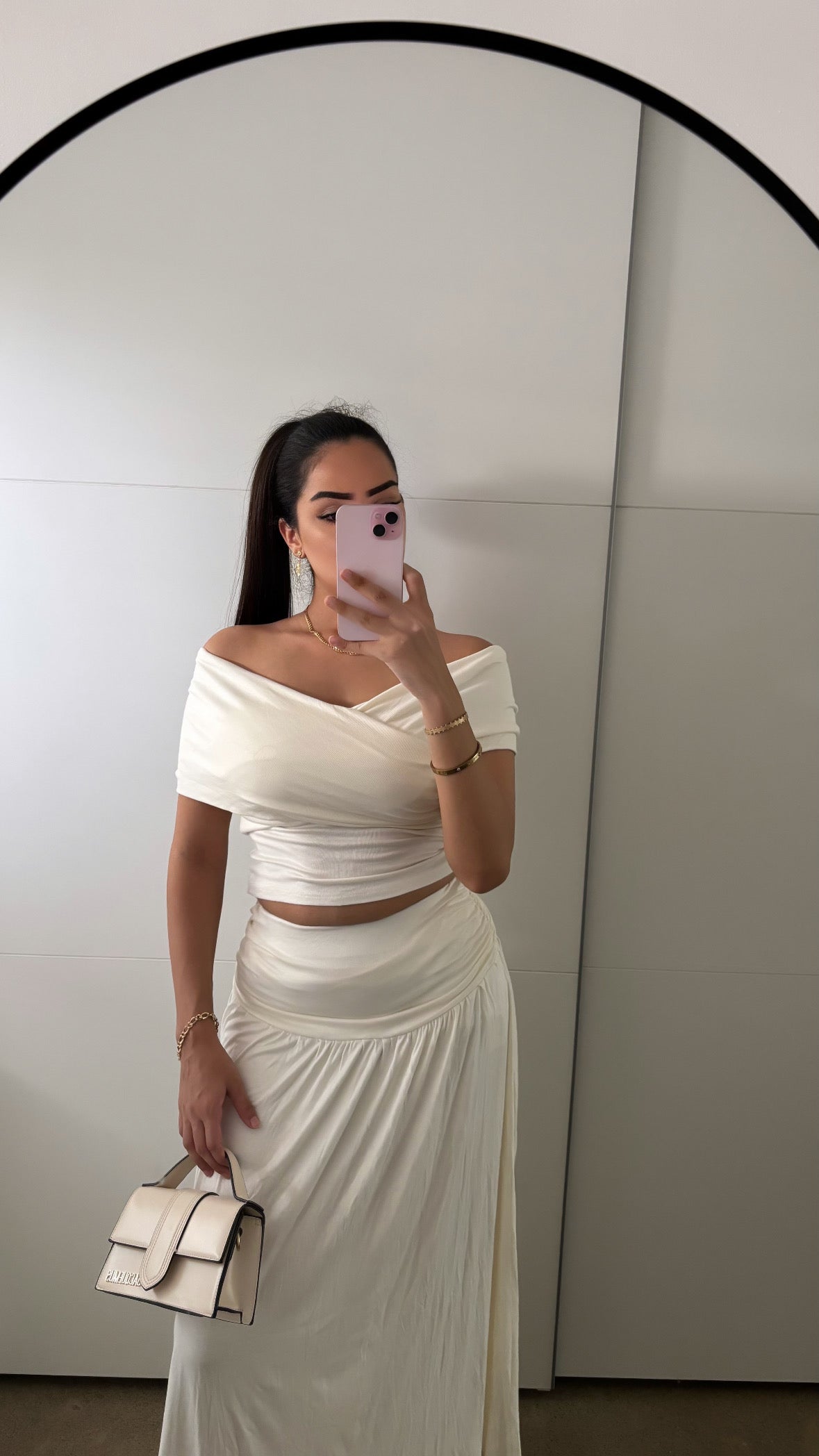 Apricot summer set with a fitted top and matching skirt in soft, stretchy fabric.